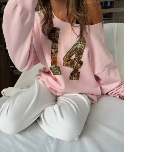 Pink Pullover Sweatshirt Tree Ring Print Digital Fabric Loose Fit Casual Top round Neck Versatile Lazy Streetwear Hoodies