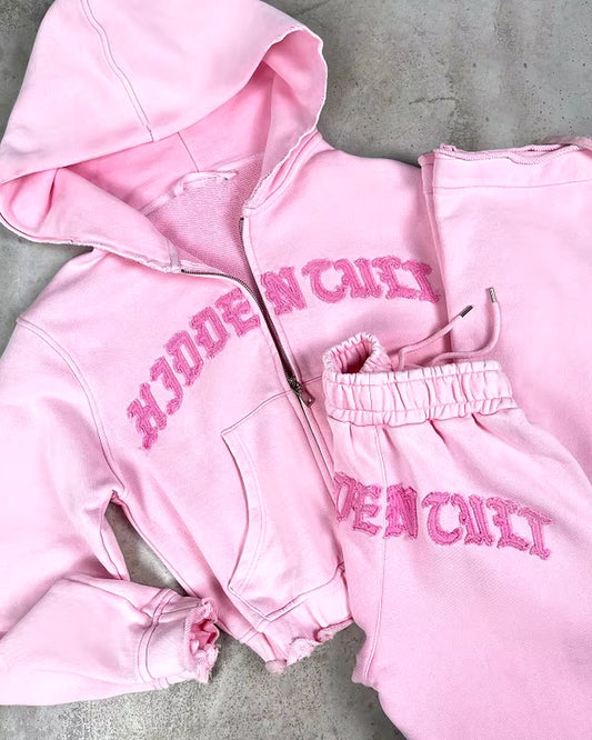 Y2K Pink Short Camouflage Zipper Hoodie Tracksuits Women Harajuku Letters Graphic Embroidery Sweatshirt Goth Straight Sweatpants